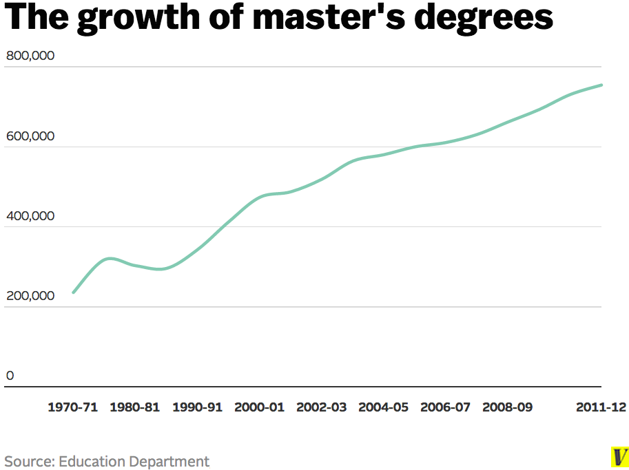 According to Vox, master’s degrees have risen by 43% since 2002. Unfortunately, however, this also means so has student debt. Though this should be deemed as an advance in our society, Vox describes the growing increase of degrees in correlation to the rigorous job qualifications present in the United States. In fact, Vox further states that master’s degrees are just as common now as regular undergraduate degrees were in the 1960’s.