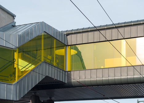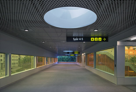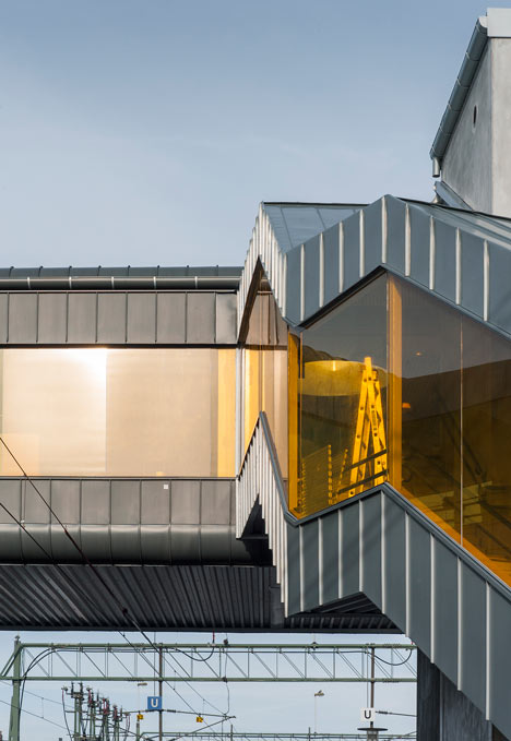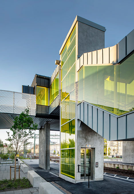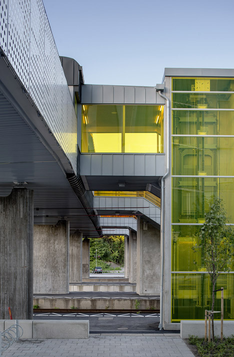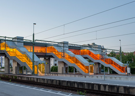 Located in Lund, Sweden, Swedish studio Metro Arkitekter designed Skyttelbron bicycle and pedestrian walkway for the Lund Central railway station, featuring the sides of the stairs “glazed in warm shades of red, orange and yellow.” Visit here for more details on the Skyttelbron Walkway and browse through the gallery below!