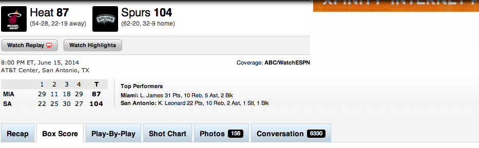 Wow, we don’t think anyone predicted the San Antonio Spurs beating the defending champions in only 5 games, but tonight they did just that! With great coaching from the legendary Gregg Popovich, the veteran Spurs had an easy win over the Miami Heat this year. Though there was much speculation about the Miami Heat making a “3-Peat” run, looks like their road to a creating a three year dynasty was not successful. Congratulations to the Spurs and coaching staff, playing team-ball was definitely shown throughout the Spurs’ playoff tenure.  Oh yea, we couldn’t forget about Kawhi Leonard’s great performance during this playoff series. Though he’s only 22, Leonard’s performance gave the Spurs the boost they needed to off-set Miami’s defense. Kawhi Leonard is your 2014 NBA Finals MVP. For more highlights and a complete recap check out ESPN.