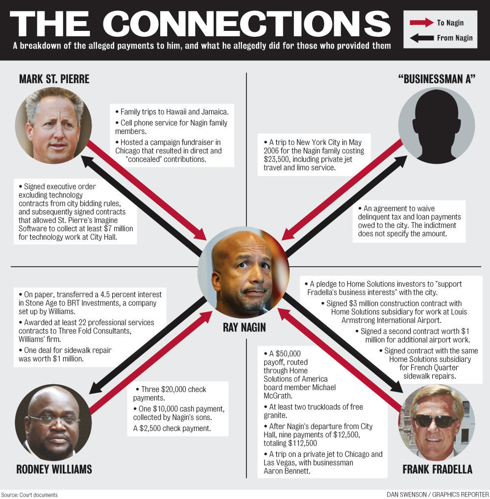 - Allowing technology vendor Mark St. Pierre, who had a substantial no-bid contract with the city, to pay for the Nagin family’s lodging and other expenses on a trip to Hawaii in December 2004 and January 2005, and then to cover first-class airfare for a family trip to Jamaica in October 2005. After the Hawaii trip, St. Pierre began paying for cell phones for members of the Nagin family, the indictment says. In 2006, St. Pierre hosted a campaign fund-raiser in Chicago at which Nagin received “concealed and direct” contributions.