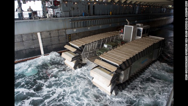 –” Here’s how the UHAC works: The tracks, which are made of what the Marines call “captured-air foam blocks,” extend like flippers to propel the craft through the water. When it hits the beach, the foam flattens to become like the tracks on a tank or a bulldozer, only much softer, according to a report from Stars and Stripes.