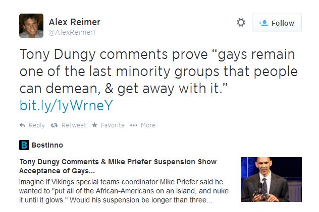 Former NFL coach Tony Dungy, recently told the Tampa Tribune, “I wouldn’t have taken him. Not because I don’t believe Michael Sam should have a chance to play, but I wouldn’t want to deal with all of it. It’s not going to be totally smooth … things will happen.” Naturally, after Dungy’s statement went public he essentially transformed himself into a media Piñata to be destroyed repeatedly by any TV personality.