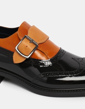 These monk brogues by Vivienne Westwood feature a leather mix upper, monk strap fastening, short wing brogue styling and a plain tread sole. Shop the brogues here.