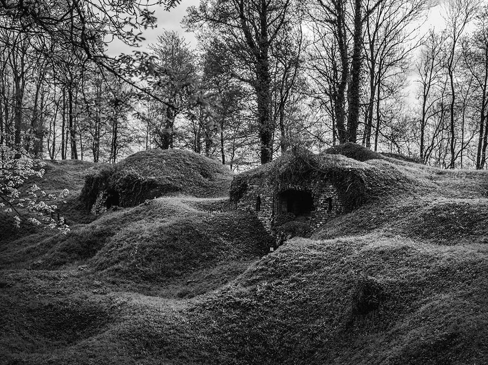 –“During World War I, the deadlock of trench warfare led both the French and German sides to tunnel beneath enemy positions. Here, the scars of artillery barrages still pockmark the ruins of a fort at Chemin des Dames, France, where some 30,000 French troops died during ten days in April 1917. Underground, French and German forces tried to penetrate each other’s tunnels, sometimes fighting hand to hand in pitch-black passageways.”–