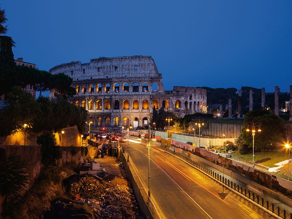 –The successors of Roman Emperor Nero largely buried his legacy from view. Beneath the Oppian Hill (at left) the remains of the palace—the Domus Aurea, or Golden House—built by and for Nero are closed to the public. By contrast, the Colosseum receives more than 10,000 visitors a day.–