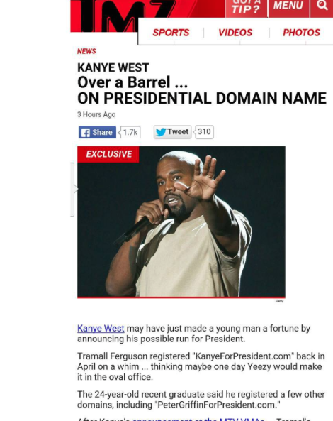 While some may deem this as “luck of the draw” or serendipity, 24 year old Tramall Ferguson is no rookie when it comes to making small acquisitions in return for a nice hefty ROI. You see, the Belleville, Illinois native recently moved to Atlanta to broaden his promising business in Financial Advising. Likewise, it should come as no to surprise that his acquisition of WWW.KANYEFORPRESIDENT.COM (for merely $1 last April) would somehow come into play after Mr. West announced his 2020 presidential bid a few weeks ago at the 2015 VMA’s.