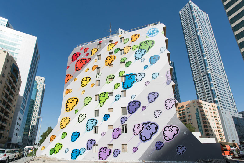 The non-profit Maraya Art Centre and Myneandyours recently completed a brightly colored mural, featuring Marwan Shakarchi’s (the artist behind Myneandyours) recognizable cloud image. The project is located on the side of a building in Sharjah, UAE.