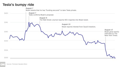 [ “The filing by the SEC in federal court in Manhattan threatens to deal a severe blow to the Palo Alto, Calif., electric car maker. Its brand and Mr. Musk are closely intertwined, and analysts have said the company’s roughly $50 billion market value is driven by Wall Street’s appreciation for Mr. Musk’s vision and skill as an innovator.