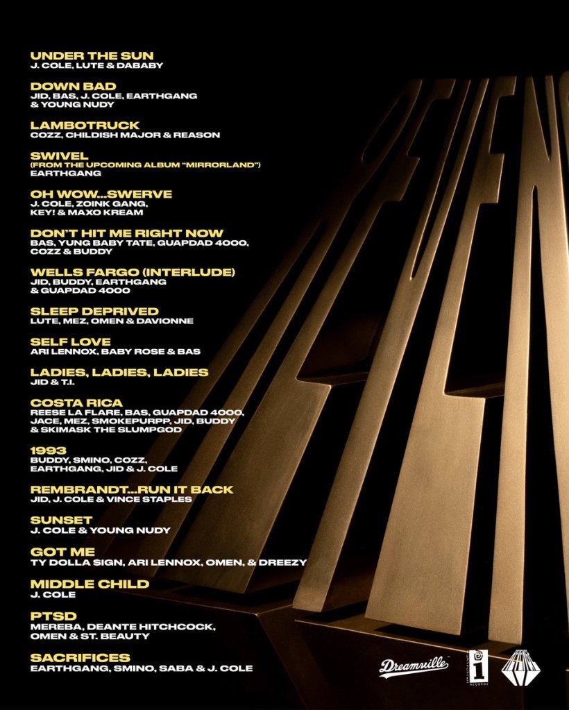 Artists: J.Cole,Lute, Dababy, JID, Bas, Earthgang, Young Nudy, Cozz, Childish Major, Reason, Zoink Gang, KEY!, Maxo Kream, Yung Baby Tate, Guapdad 4000, Buddy, Mez, Omen, Davionne, Ari Lennox, Smokepurp, Dreezy, Smino, Saba, Skimask the Slumpgod, Vince Staples, Ty Dolla Sign, Deante Hitchcock, Mereba, St. Beauty, Mez & Baby Rose